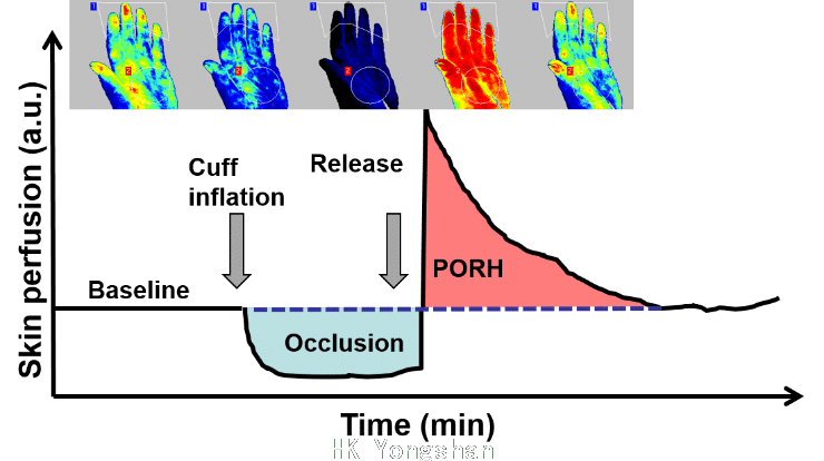 可以通过观察对反应性充血的反应来评估血管功能。反应性充血是由于动脉血液供应的暂时阻塞导致的血流增加。内皮功能受损的患者显示出与健康人不同的反应。通常通过使用血压袖带进行动脉闭塞来进行测试,通常持续几分钟。在闭塞之后,压力突然释放,导致大量血液流入先前闭塞的组织。在闭塞之前,期间和之后进行测量灌注,并且通过灌注的幅度和改变,所花费的时间等相关的若干参数可以给出关于受试者的血管健康的信息。