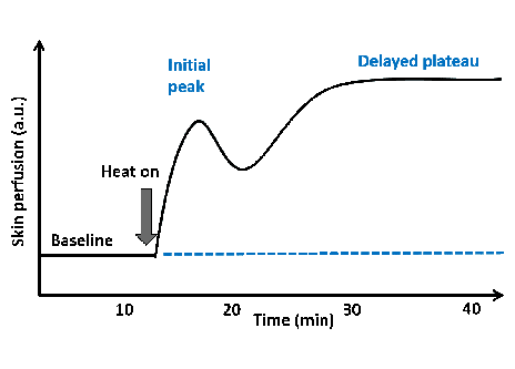 局部加热皮肤可引起附近血管舒张。 在健康个体中,对热充血的反应表现出可预测的模式。 其特征在于由感觉信号传入皮肤而导致的血液灌注的初始峰值,以及由一氧化氮释放介导的二次数值上升和平稳期。