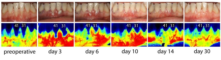 图2,患者在改良的冠向隧道手术后的第41和31号牙齿(标记)上的游离牙龈移植物的代表性照片和LSCI图像。 图像表示术前灌注并显示第3,6,10,14和30天的伤口愈合和灌注。