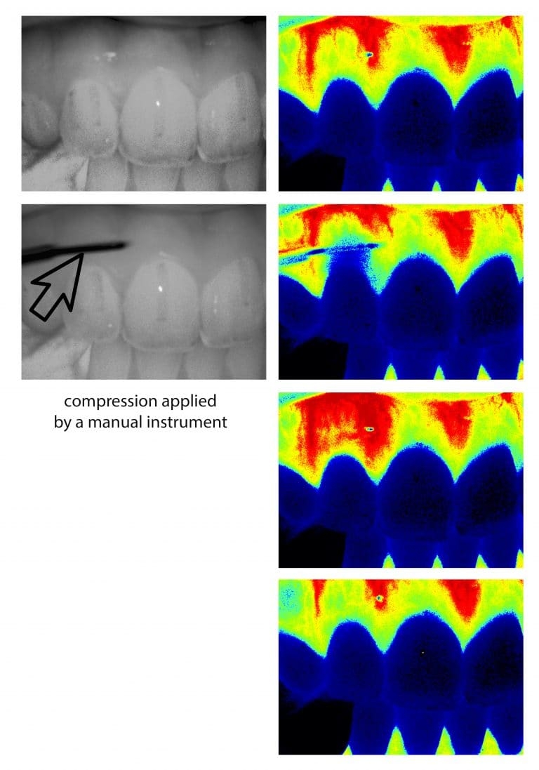 在临时压迫过程中,附着的牙龈被压到下面的骨头,导致粘膜骨膜的血管闭塞,从而引起短暂的局部缺血。 作为对短暂缺血期的反应,发生了牙龈血流的暂时增加,称为反应性充血。 在压缩释放后20分钟,血流返回基线。